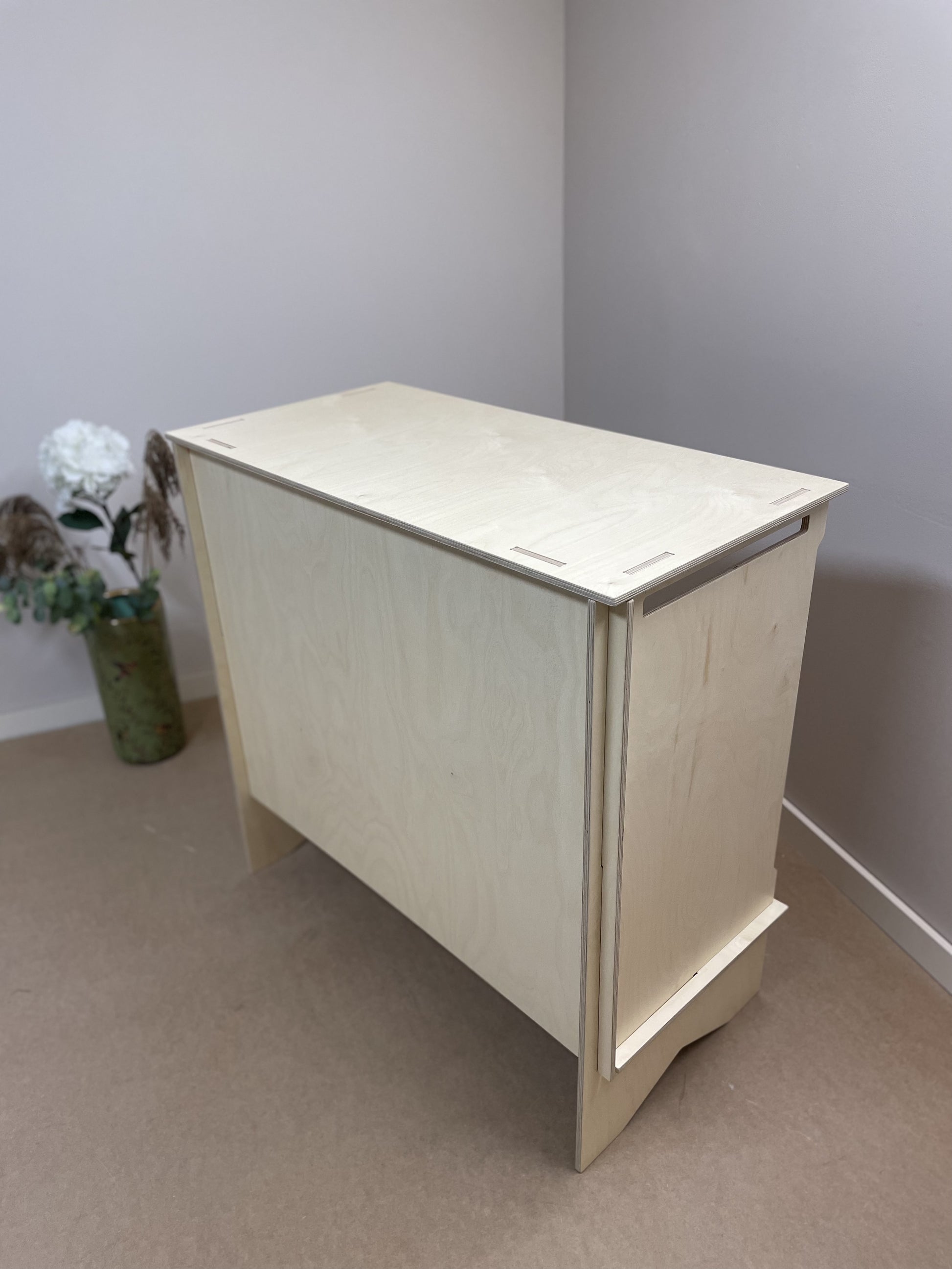 Le produit lui-même est fabriqué à partir de contreplaqué de bouleau de 12 mm (0,47 po) d'épaisseur. Pour la finition du dessus, nous avons un vernis mat transparent, pour garder la couleur d'origine du bois visible. Conçu pour de multiples usages et pour être transformé en paquet plat pour un déplacement plus facile.